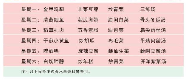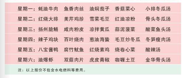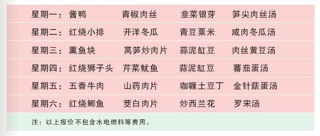 一大葷兩個(gè)素菜一湯一米飯一大葷一小葷一個(gè)素菜一湯一米飯一大葷一小葷兩個(gè)素菜一湯一米飯經(jīng)濟套餐標準報價(jià):8.00元/餐(一大葷二素菜),米飯、湯任食。9.00元/餐(一大葷一小葷一素菜),米飯、湯任食。10.00元/餐(一大葷一小葷二素菜),米飯、湯任食。12.00元/餐(一大葷一小葷二素菜一份水果),米